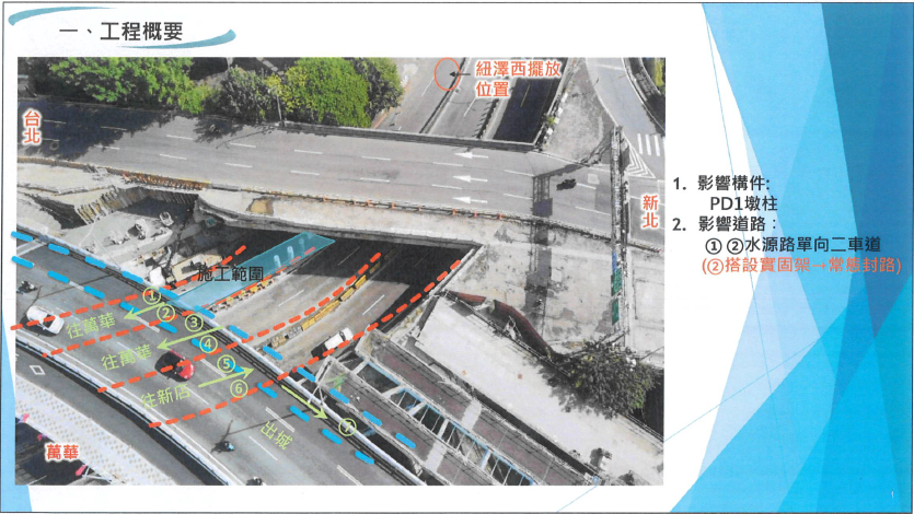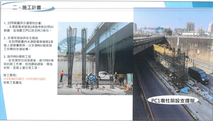 北市府工務局新建工程處將於28日(周日)上午9時起,至5月28日(周二)下午5時止,進行中正橋改建工程及代辦管線附掛工程-PD1墩柱施工作業,施工期間將封閉水源路慢車道第2車道(廈門街至中正橋下),警方提醒用路人注意,並建議經過時改道。